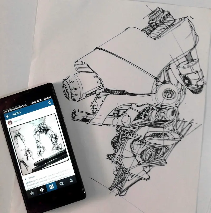 At first, I looked at the amazing work of a concept artist named Darren Quach. I found his Instagram account: dqsketches and his line work really attract my attention. His sketch lines are fresh and lively, and I really wanted to learn from him. But instead of copying exactly, I started to think: what are the basic parts that make machines look cool?