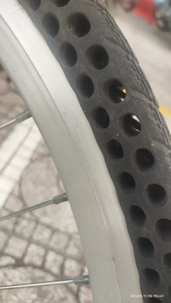 Innovation can be as simple as changing a tiny detail that makes life easier or more functional. The bike tires I saw are a perfect example: solid rubber with holes to prevent flats, which is brilliant for busy city bikes.