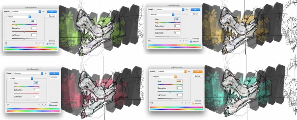 Colour breathes life into sketches. I chose red to add intensity but found it too bloody at first. Luckily, Photoshop’s Hue/Saturation adjustment allows you to quickly test multiple colour variations. There is nothing better than colour to give life to any sketch. I decided on red, but it looks too bloody.